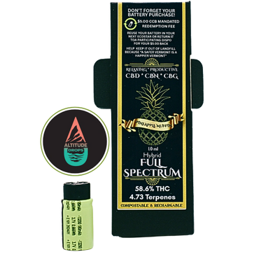 Altitude Drops has come together in partnership with Green Mountain Sativa (Stockton, VT) and MothaPlant (St. Albans, VT). This limited-release cart is crafted from single-sourced, sun grown, full-spectrum flower and packaged in a rechargable and recyclable cart with a reusable battery.